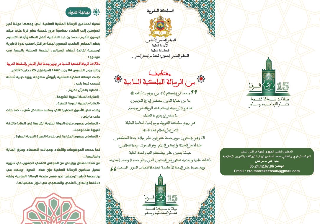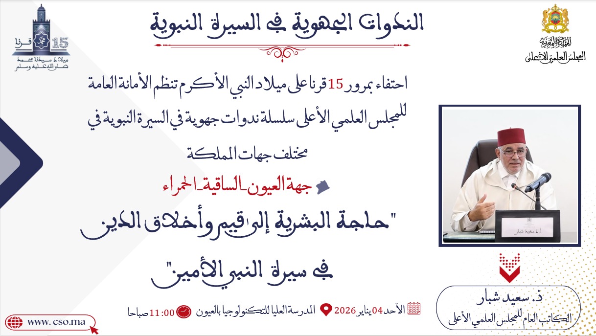احتفاء بمرور 15 قرنا على ميلاد النبي الأكرم سيدنا محمد صلى الله عليه وسلم، نظمت الأمانة العامة للمجلس العلمي الأعلى بجهة العيون الساقية الحمراء ندوة جهوية في السيرة النبوية، أطرها فضيلة الكاتب العام للمجلس العلمي الأعلى الدكتور سعيد شبار.