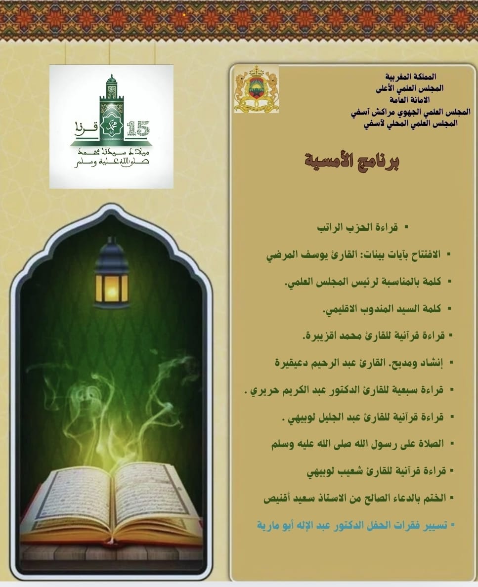 وتخليدا لليوم الوطني للاحتفال بالمساجد، ينظم المجلس العلمي المحلي بآسفي بتنسيق مع المندوبية الإقليمية للشؤون الإسلامية بآسفي حفلا دينيا وأمسية قرآنية وإنشادية.