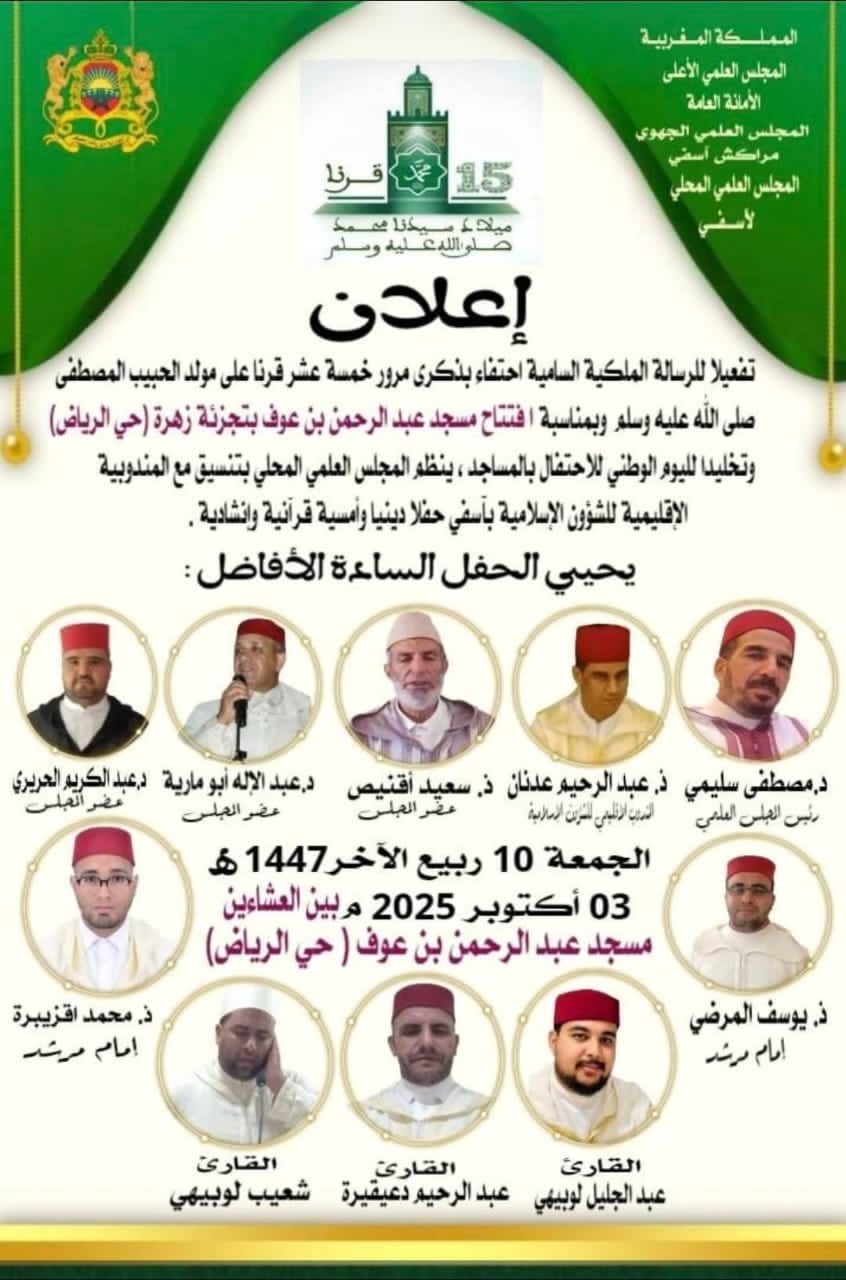 تفعيلا للرسالة الملكية السامية للاحتفاء بذكرى خمسة عشر قرنا على مولد الحبيب المصطفى صلى الله عليه وسلم وبمناسبة: افتتاح مسجد عبد الرحمن بن عوف بتجزئة زمرة (حي الرياض)