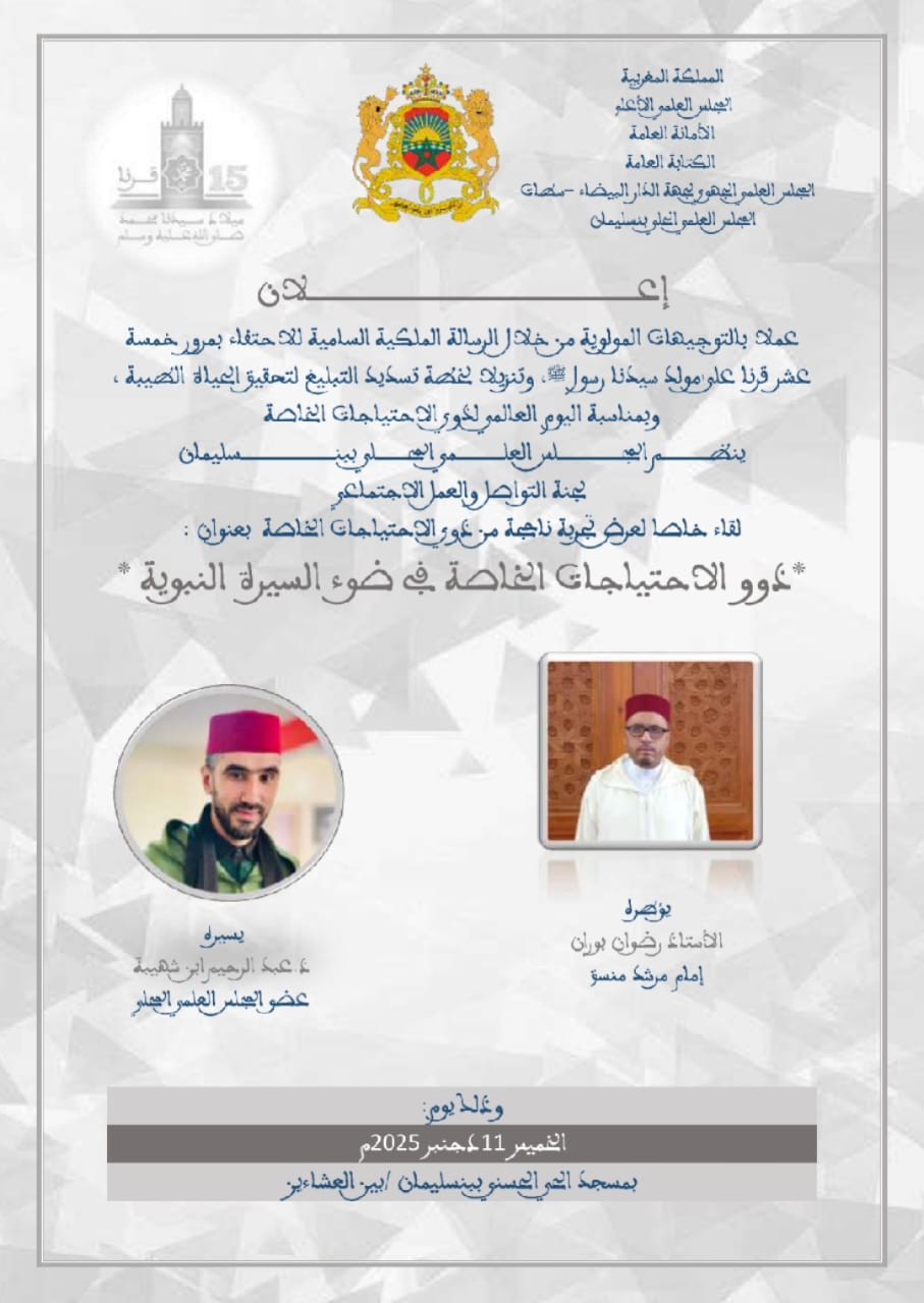 عملا بالتوجيهات المولوية من خلال الرسالة الملكية السامية للاحتفاء بمرور خمسة عشر قرنا على مولد سيدنا رسول الله صلى الله عليه وسلم، وتنزيلا لخطة تسديد التبليغ لتحقيق الحياة الطيبة، وبمناسبة اليوم العالمي لذوي الاحتياجات الخاصة، ينظم المجلس العلمي المحلي ببنسليمان لجنة التواصل والعمل الاجتماعي لقاء خاصا لعرض تجربة ناجحة من…