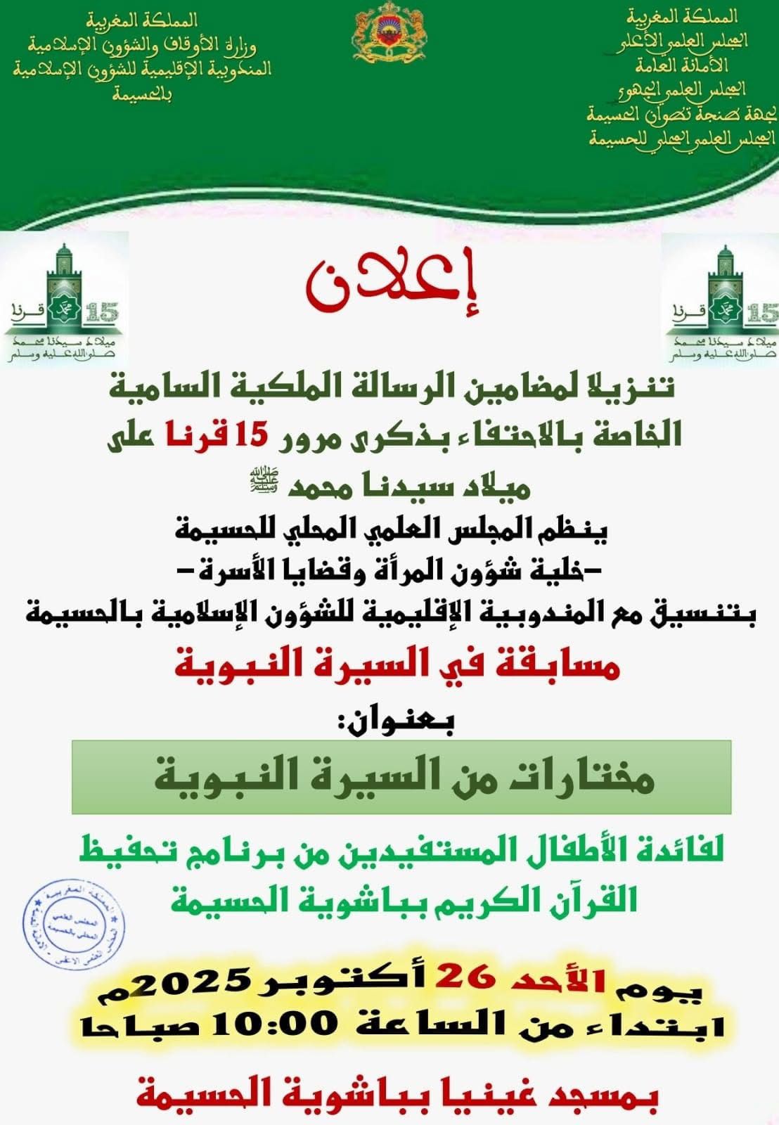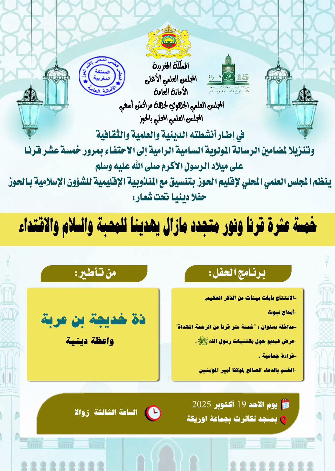 احتفاء بمرور 15 قرنا على ميلاد النبي الأكرم محمد صلى الله عليه وسلم،وتنزيلا لمضامين الرسالة المولوية السامية الموجهة إلى علماء المملكة الشريفة في الموضوع، نظم المجلس العلمي الجهوي لجهة بني ملال-خنيفرة بتنسيق مع منصة محمد السادس للحديث الشريف، يوما دراسيا لفائدة أعضاء المجالس العلمية المحلية ومنسقي الأئمة المرشدين والمرشدات والواعظات، في موضوع: