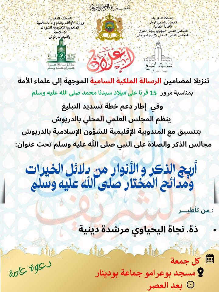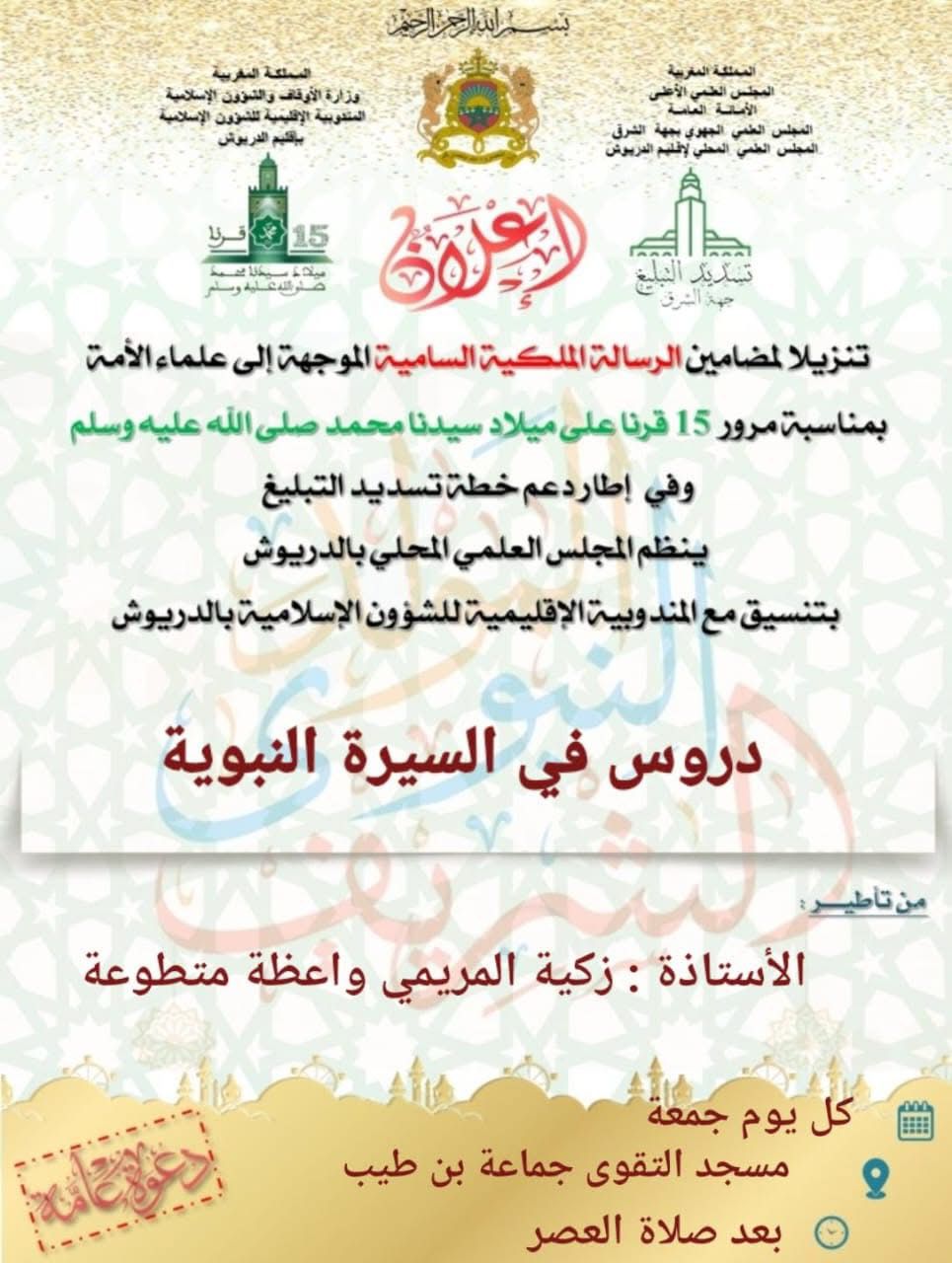 ينظم المجلس العلمي المحلي بالدريوش بتنسيق مع المديرية الإقليمية للشؤون الإسلامية بالدريوش دروسا في السيرة النبوية