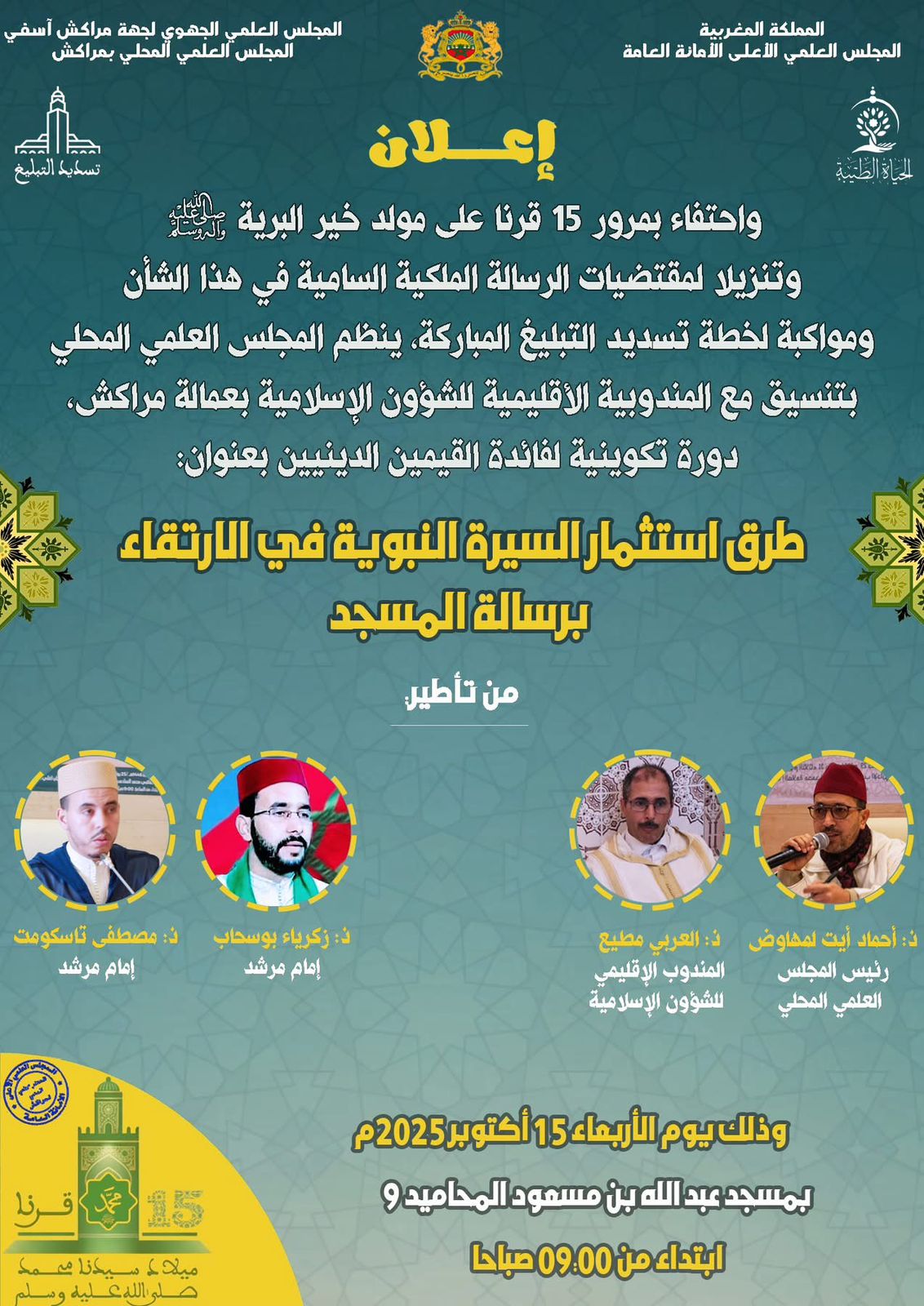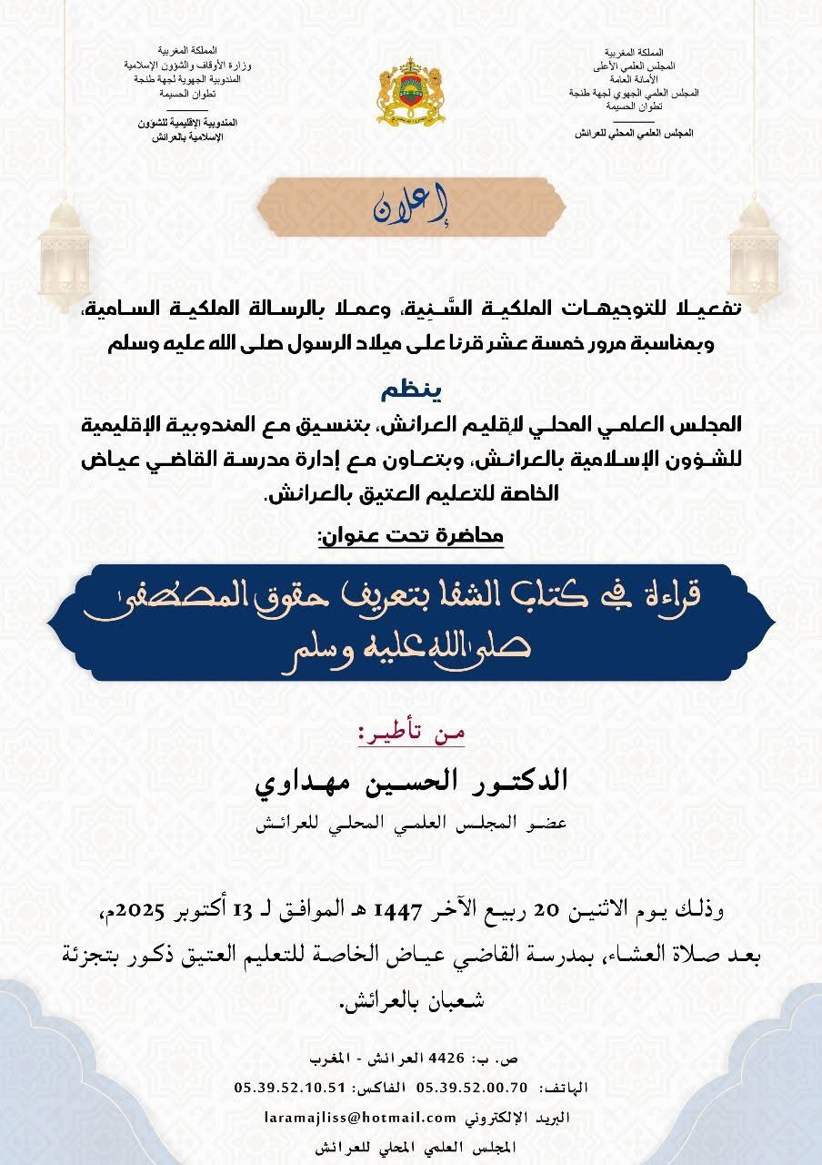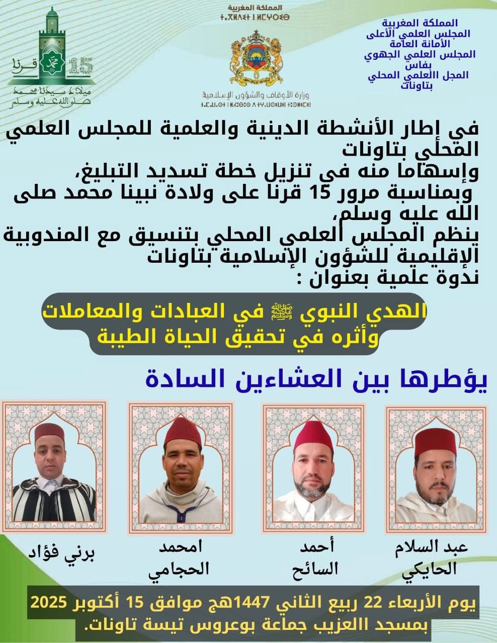 في إطار الأنشطة الدينية والعلمية للمجلس العلمي المحلي بتاونات، وإسهامًا منه في تنزيل خطة تسديد التبليغ، وبمناسبة مرور 15 قرنا على ولادة نبينا محمد صلى الله عليه وسلم، ينظم المجلس العلمي المحلي بتاونات، بالتنسيق مع المندوبية الإقليمية للشؤون الإسلامية بتاونات، ندوة علمية بعنوان: