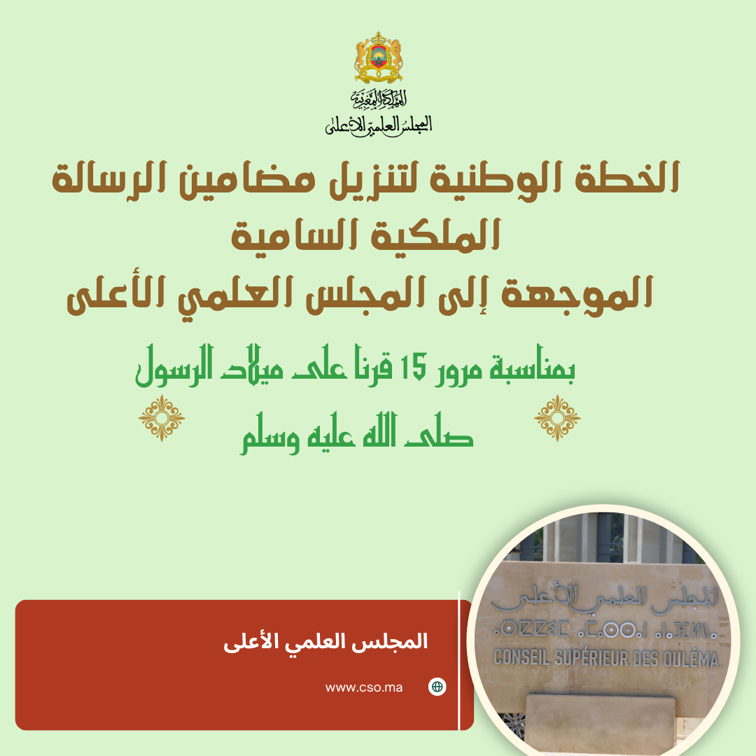 في إطار أنشطته المتنوعة، وفي سياق العناية بالقرآن الكريم وبسنة المصطفى صلى الله عليه وسلم، وبمناسبة الاحتفال بمرور خمسة عشر قرناً على ميلاد خير خلق الله، محمد بن عبد الله صلى الله عليه وسلم، يعلن المجلس العلمي المحلي لإقليم الرشيدية بتنسيق مع المندوبية الإقليمية للشؤون الإسلامية بالرشيدية عن تنظيم ندوة علمية لفائدة رواد المساجد بعنوان: