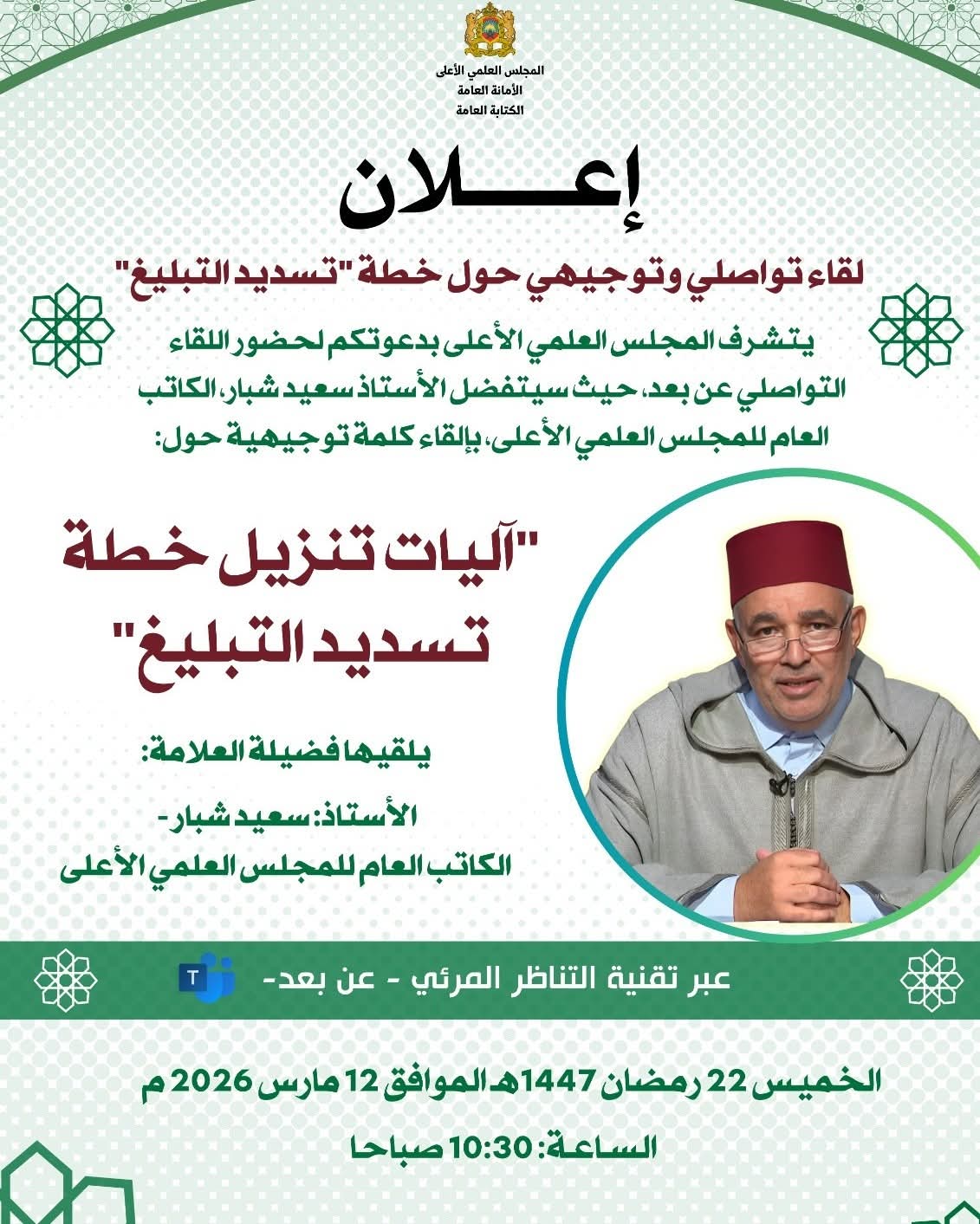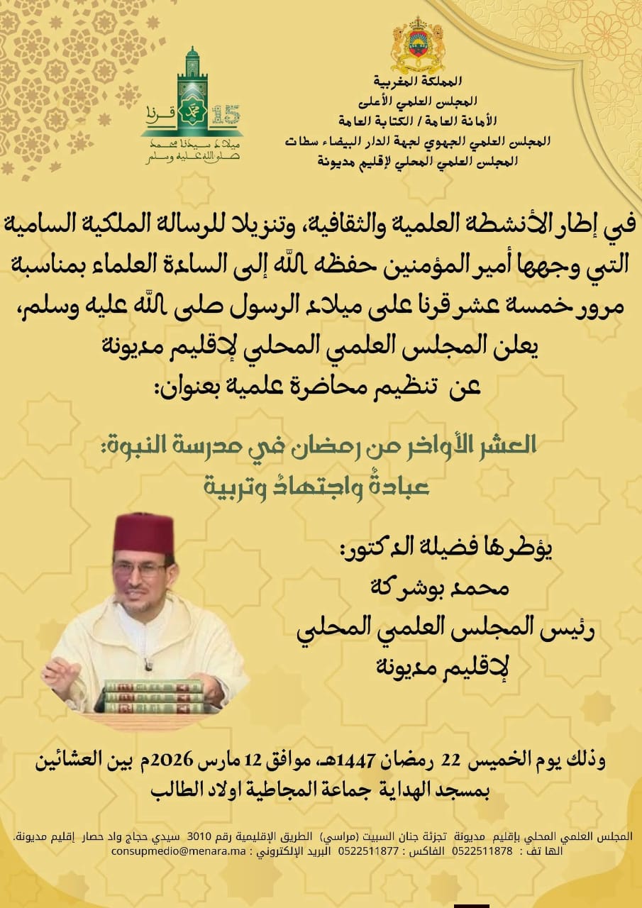 في إطار الأنشطة العلمية والثقافية، وتنزيلا للرسالة الملكية السامية التي وجهها أمير المؤمنين حفظه الله إلى السادة العلماء بمناسبة مرور خمسة عشر قرنا على ميلاد الرسول صلى الله عليه وسلم، يعلن المجلس العلمي المحلي لمديونة عن تنظيم محاضرة علمية بعنوان :