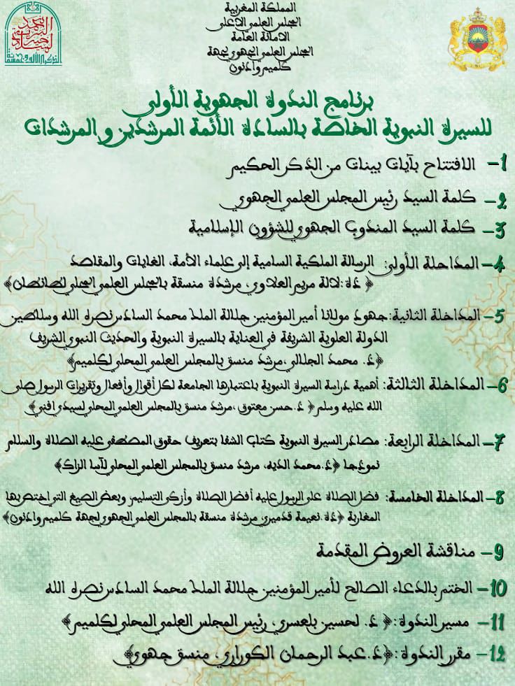 استجابة للتوجيهات الملكية السامية، وبمناسبة مرور خمسة عشر قرناً على ميلاد الرسول الأعظم ﷺ، ينظم السادة الأئمة المرشدون والمرشدات بجهة كلميم وادنون بدعم من المجلس العلمي الجهوي لكلميم وبتنسيق مع المندوبية الجهوية للشؤون الإسلامية بجهة كلميم وادنون، الندوة الجهوية الأولى للسيرة النبوية