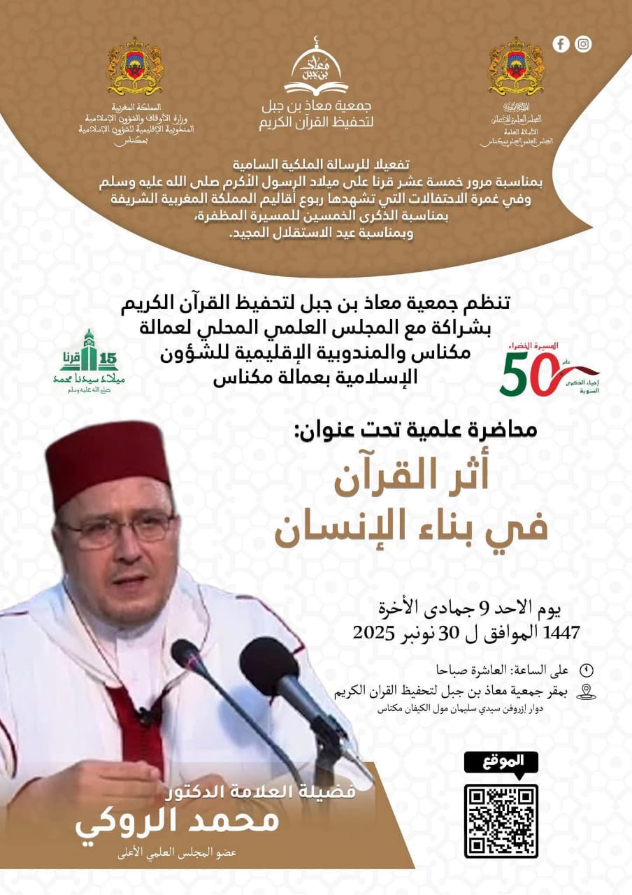 تنظم جمعية معاذ بن جبل لتحفيظ القرآن الكريم بشراكة مع المجلس العلمي المحلي لعمالة مكناس و المندوبية الإقليمية للشؤون الإسلامية محاضرة علمية تحت عنوان: “أثر القرآن في بناء الإنسان”