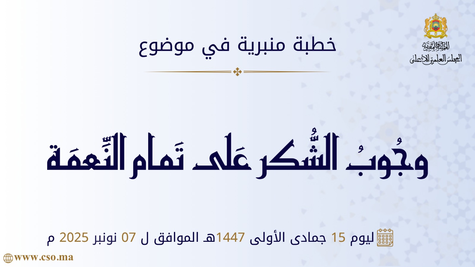 خطبة منبرية في موضوع “وُجُوبُ الشُّكْرِ عَلَى تَمَامِ النِّعْمَةِ” ليوم 15 جمادى الأولى 1447 موافق 07 نونبر 2025 م